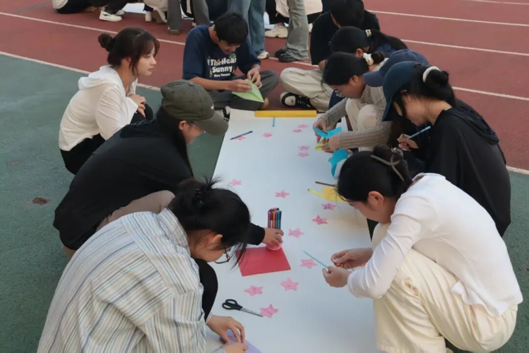 活动从“松鼠搬家”开始,现场迅速升温,同学们在分组与重组中打破隔阂。随后的“共绘蓝图”环节中,成员们借助绑绳画笔与情景卡片,在集体创作中展现团队智慧。“同心传递”环节通过分组比拼锤炼衔接默契,“凝心破结”则在手拉手解结的过程中强化沟通与协作能力。活动尾声的“星光寄语”温情洋溢,同学们在星星卡片上写下感悟与祝福,共同装饰成集体纪念画卷。