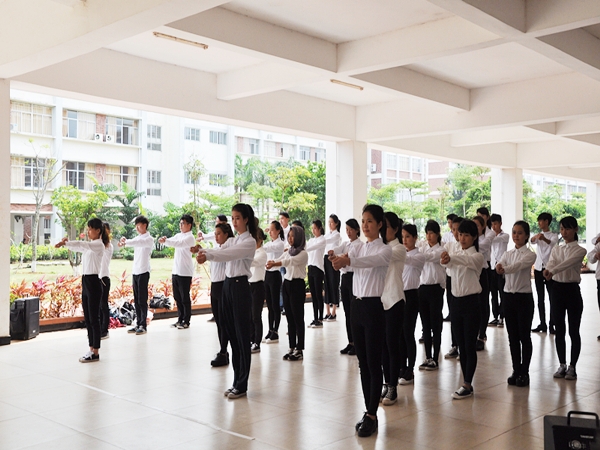 本院4月12日讯(林吉帆 摄影报道)2016年4月12日下午14时许,为进一步提高同学们文明素养,提升校园文明层次,扎实推进学校精神文明建设,响应海口市“双创”工作。我院在三栋教学楼下举行首届“走双创道路 扬礼仪文明”礼仪操大赛,本次比赛邀请了校内导师担任此次评委,党总支书记蒙永坚、党总支副书记麦锐、学工办主任赵志凌、副主任文嘉静及2015级辅导员到场观看了比赛,本次共2015级18个参赛班级。
