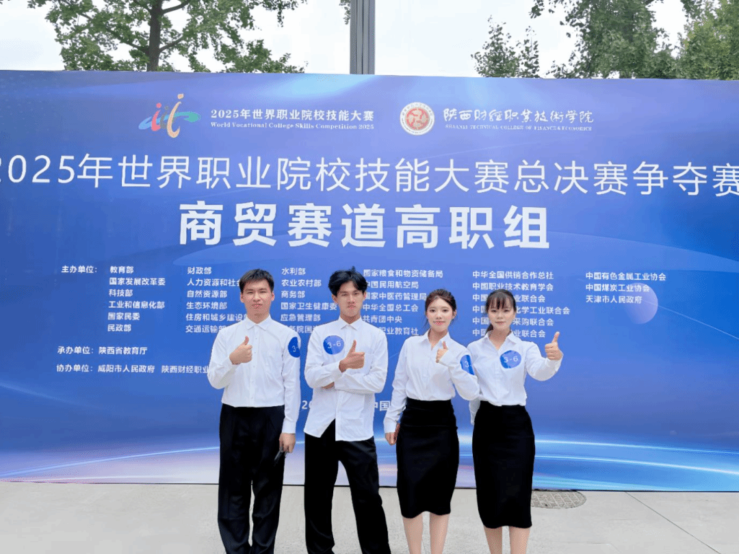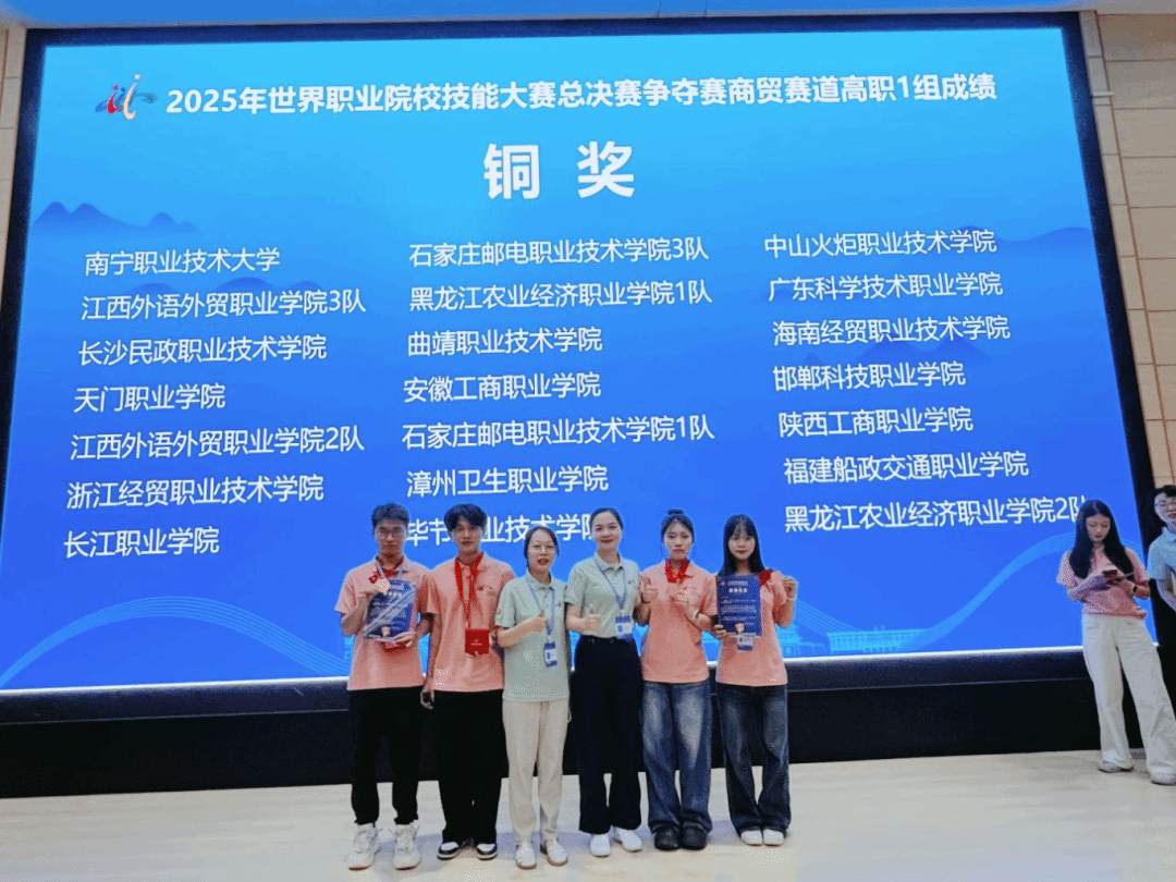 2025 年 8 月 25 日~29 日,世界职业院校技能大赛总决赛争夺赛商贸赛道在陕西财经职业技术学院举行,来自全国 32 个省、自治区、直辖市和新疆生产建设兵团的 77 支参赛队伍汇聚一堂,在操作中交流经验,在竞争中提升技能,生动诠释了 “技炫青春,能创未来” 的大赛主题。由海南经贸职业技术学院国际贸易学院电子商务专业的学生高小芸、钟兰、孙昌志和冯礼召组成的海南省代表队在经过激烈角逐后,荣获铜奖。