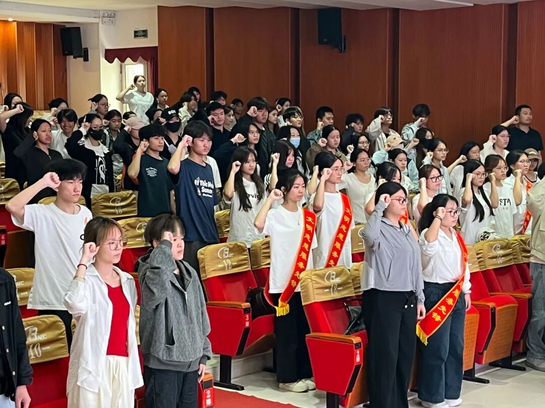 在领誓人吴芷涵同学的带领下,全场学生高举右拳,庄严宣誓:“我以青春的名义庄严宣誓:遵纪守法,知行合一;诚信为本,友善待人;摒弃陋习,文明修身……”铿锵有力的誓言回荡,彰显了全体国贸人践行文明、守护文明的坚定决心。与会学生有序移步至台前,在“争当文明先锋 共赴文明之约”主题横幅上郑重签下自己的名字。