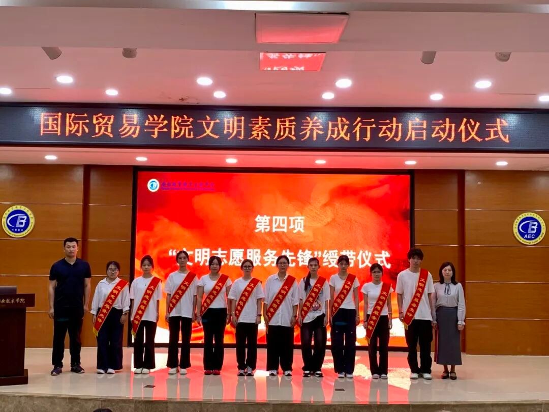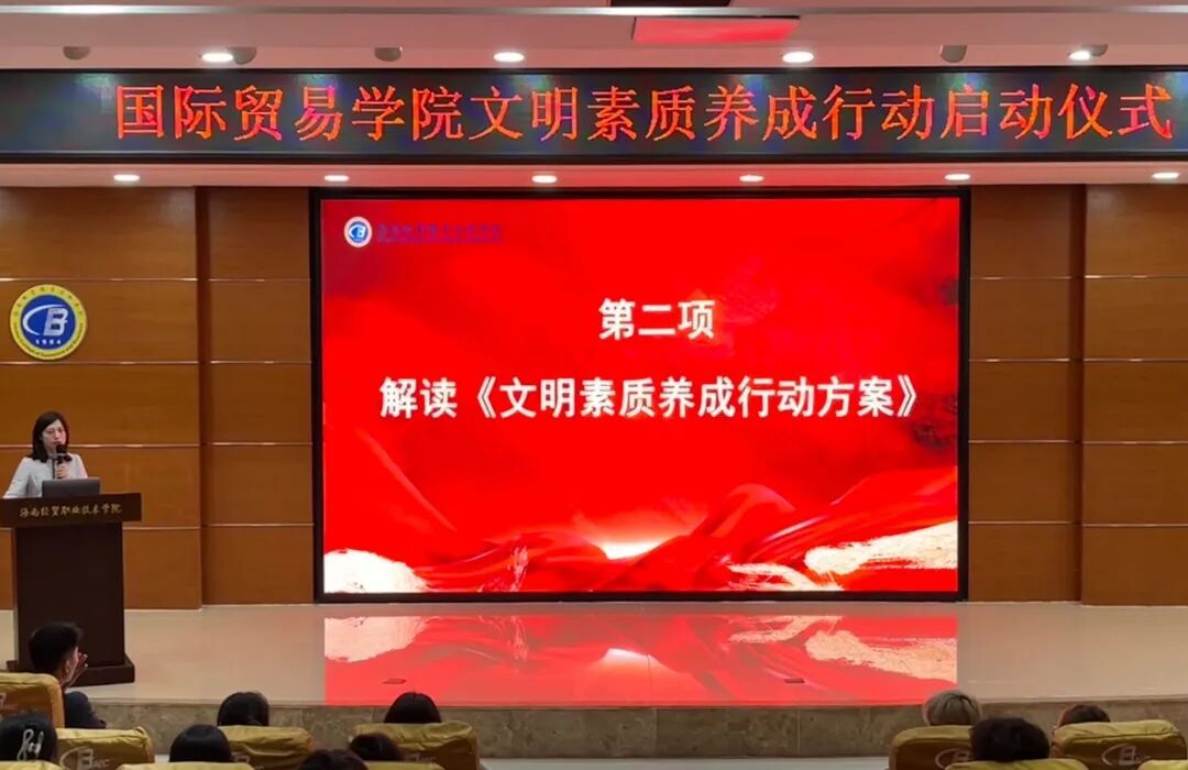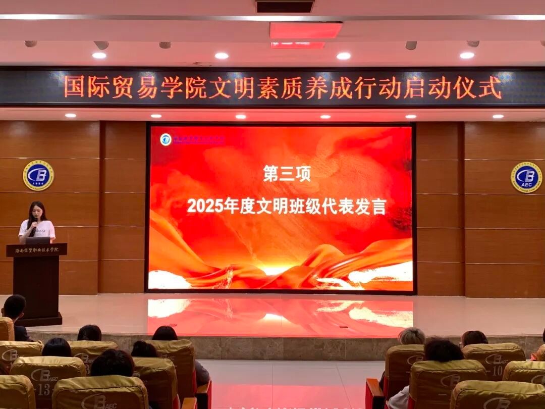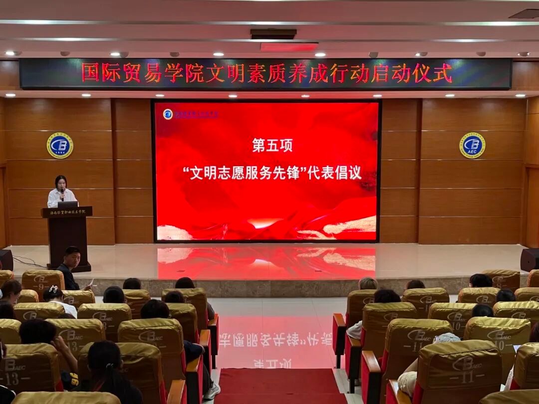 近日,国际贸易学院举行“争当文明先锋 共赴文明之约”文明素质养成行动启动仪式,深入推进文明校园建设,引导全院师生将文明素养内化于心、外化于行。学院全体辅导员、团学干部及各班级学生代表齐聚一堂,共同开启学院文明素质养成崭新征程。
